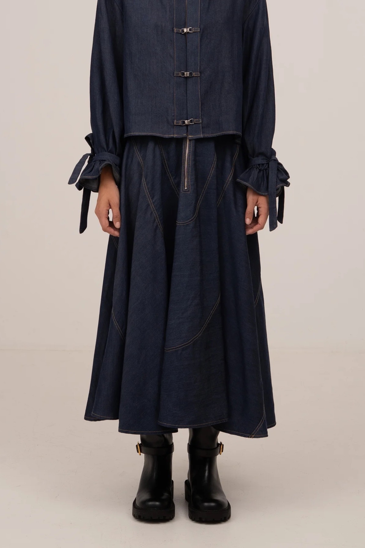 This denim midi skirt combines retro charm with a flowing, feminine silhouette. Crafted from soft, structured denim, it offers natural, flattering movement with every step. Its low-rise design and side metal zipper add a modern, relaxed touch, perfect for those seeking a casual yet elegant look.