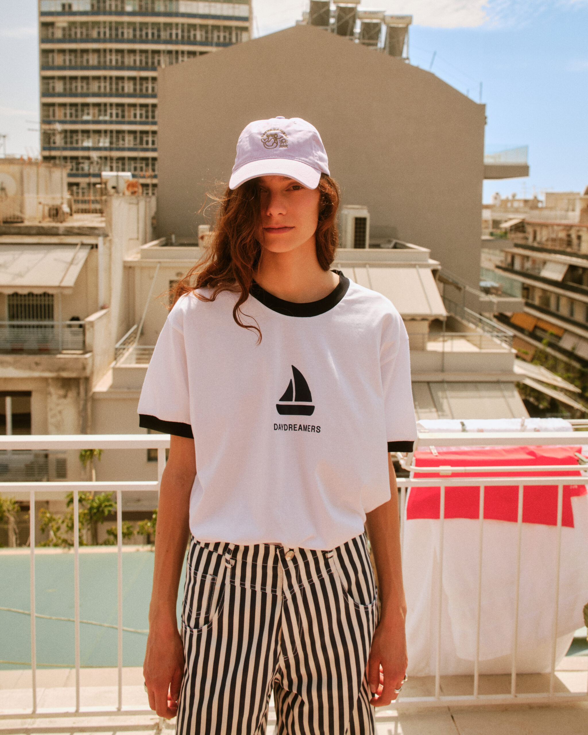 Designed in a one size oversized fit, it comfortably covers sizes Small to Large, offering a relaxed silhouette that adapts naturally across different body types. The piece is finished with a Daydreamers graphic, developed as part of the “Boy on a Dolphin” summer collection, bringing a distinct visual identity to the garment.