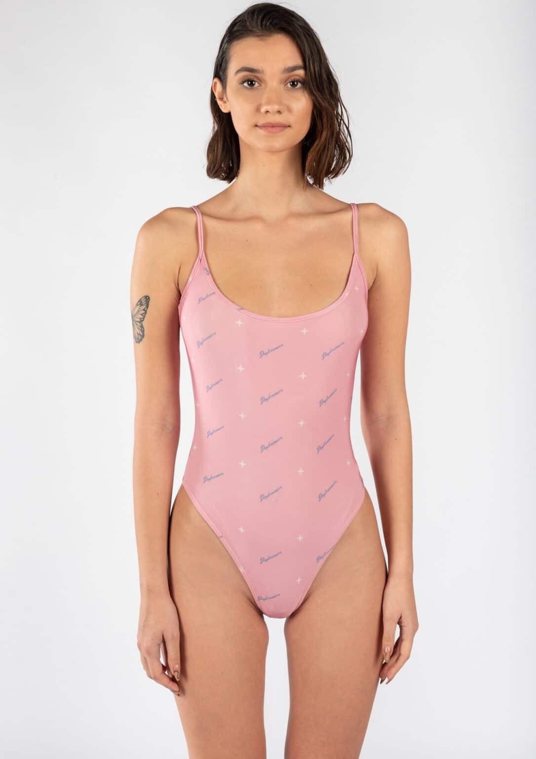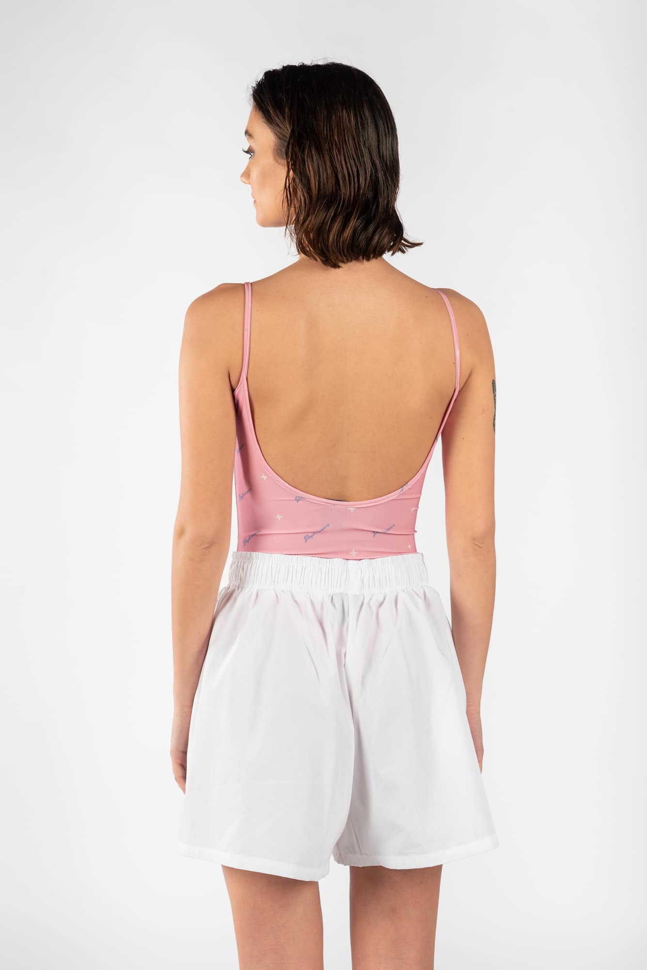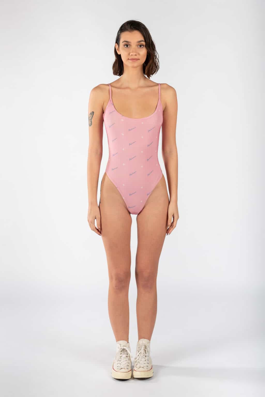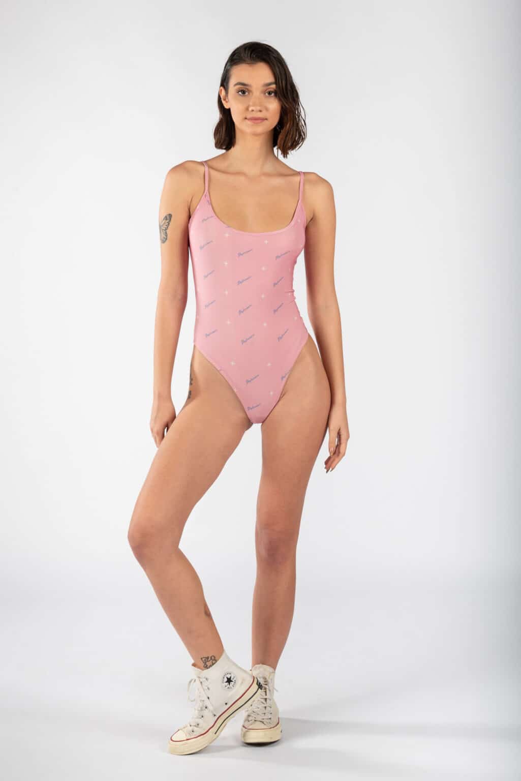 Daydreamers The Brand Dancing Bodysuit Pink  made from  stretchy lycra and designed to suit any shape or size. It has a scooped back plus high-cut legs and a thong base that are practically seamless under pants or skirts.