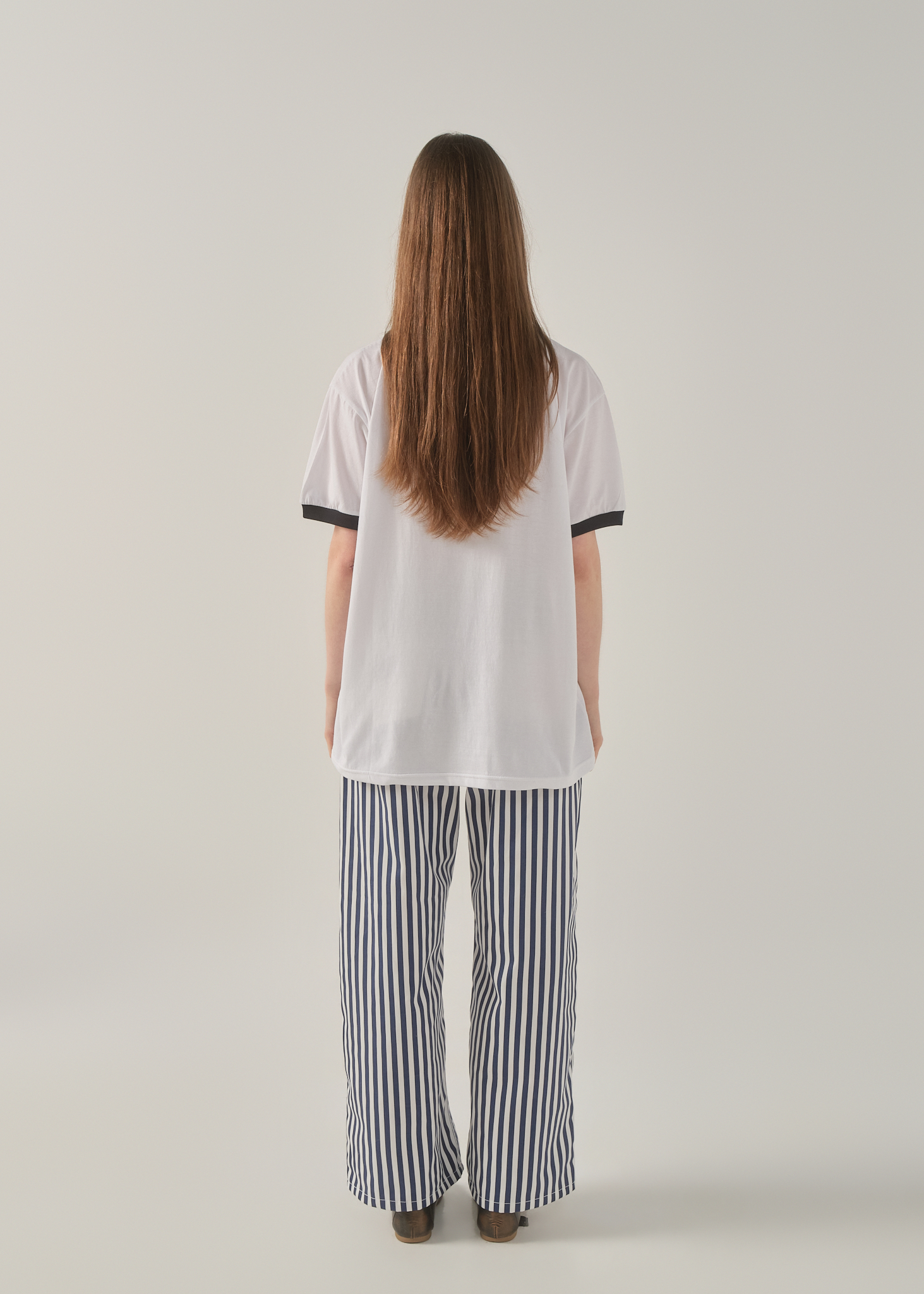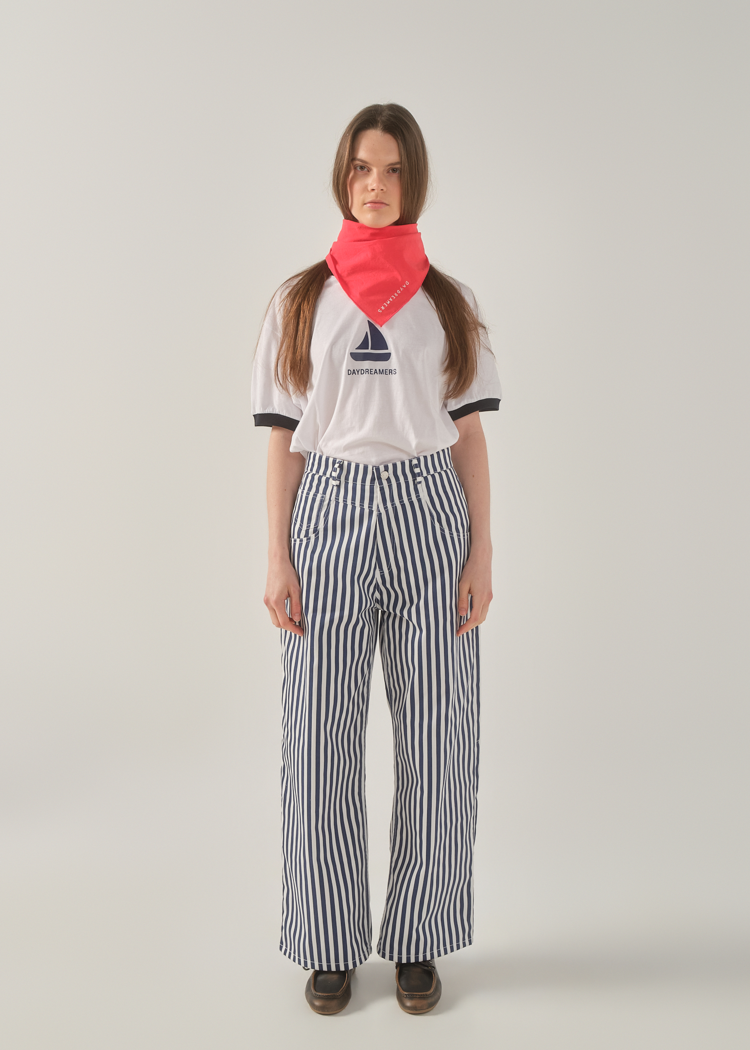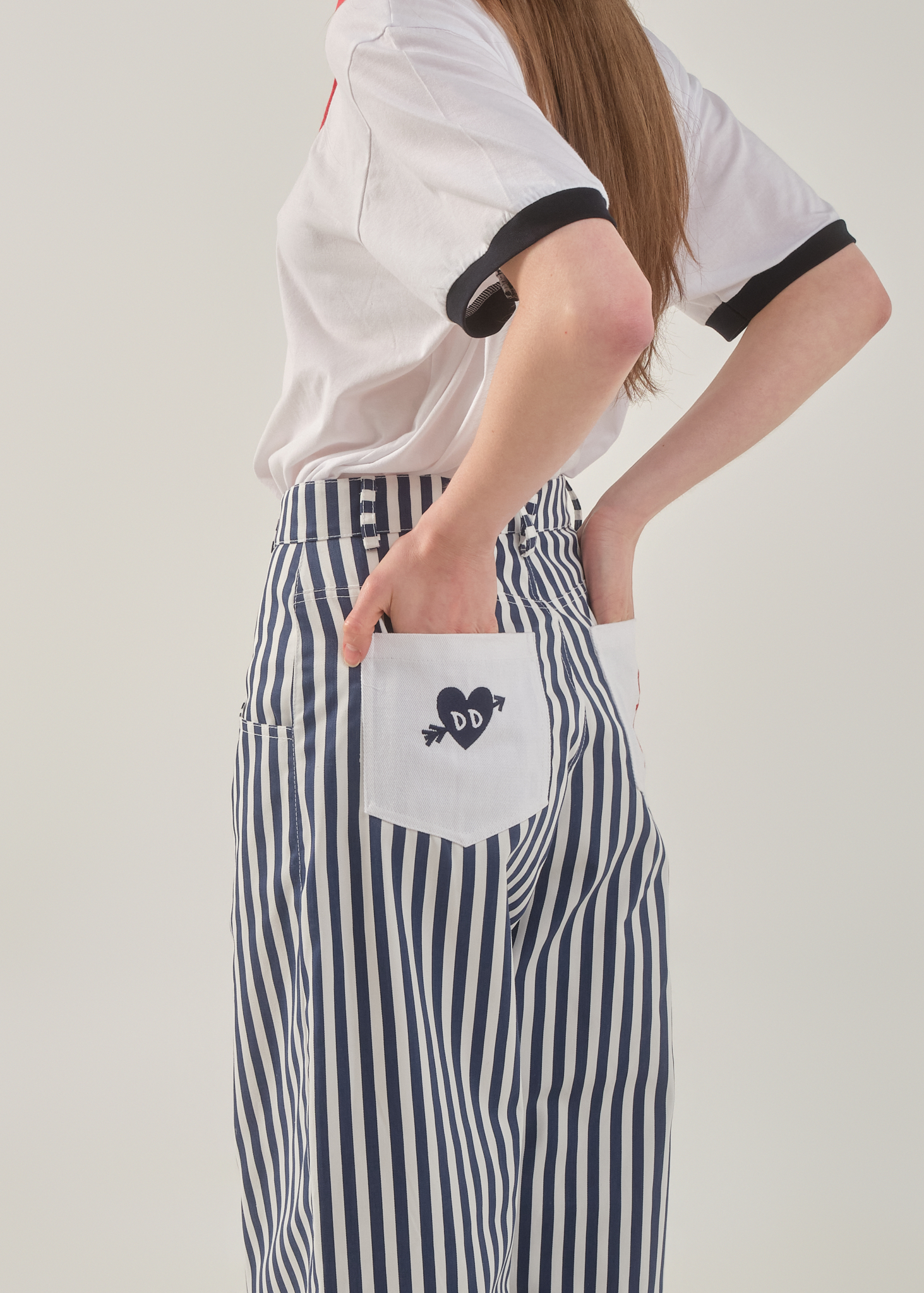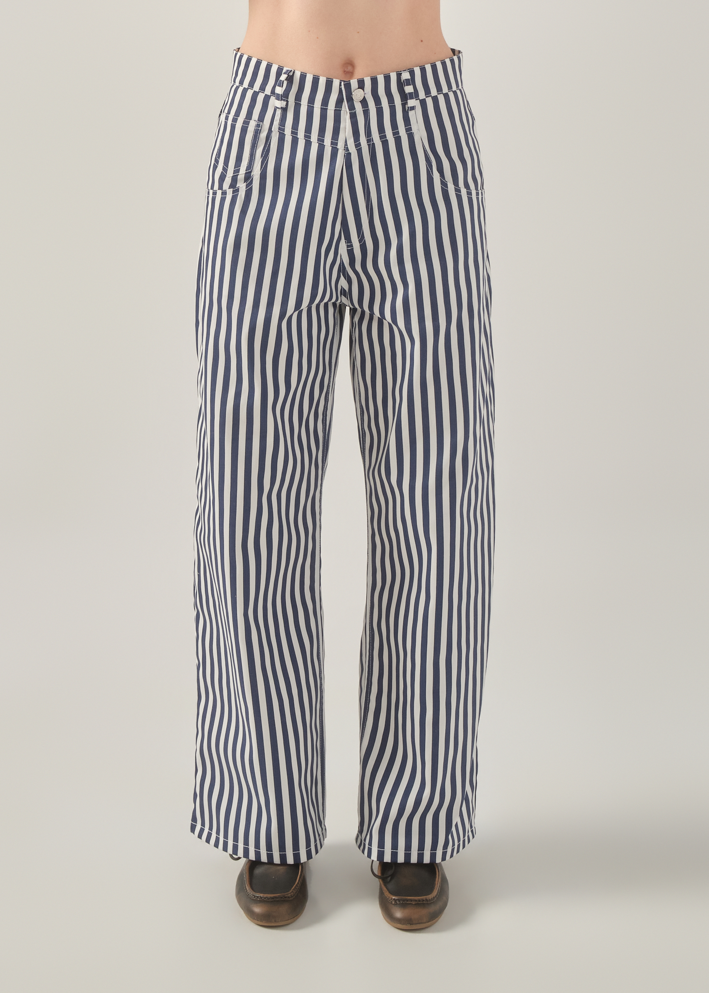 The Myth Striped Pants are a workwear-inspired essential with a strong nautical character. Designed in a navy and white striped fabric, they draw inspiration from classic marinera aesthetics, reinterpreted in a modern, everyday silhouette.