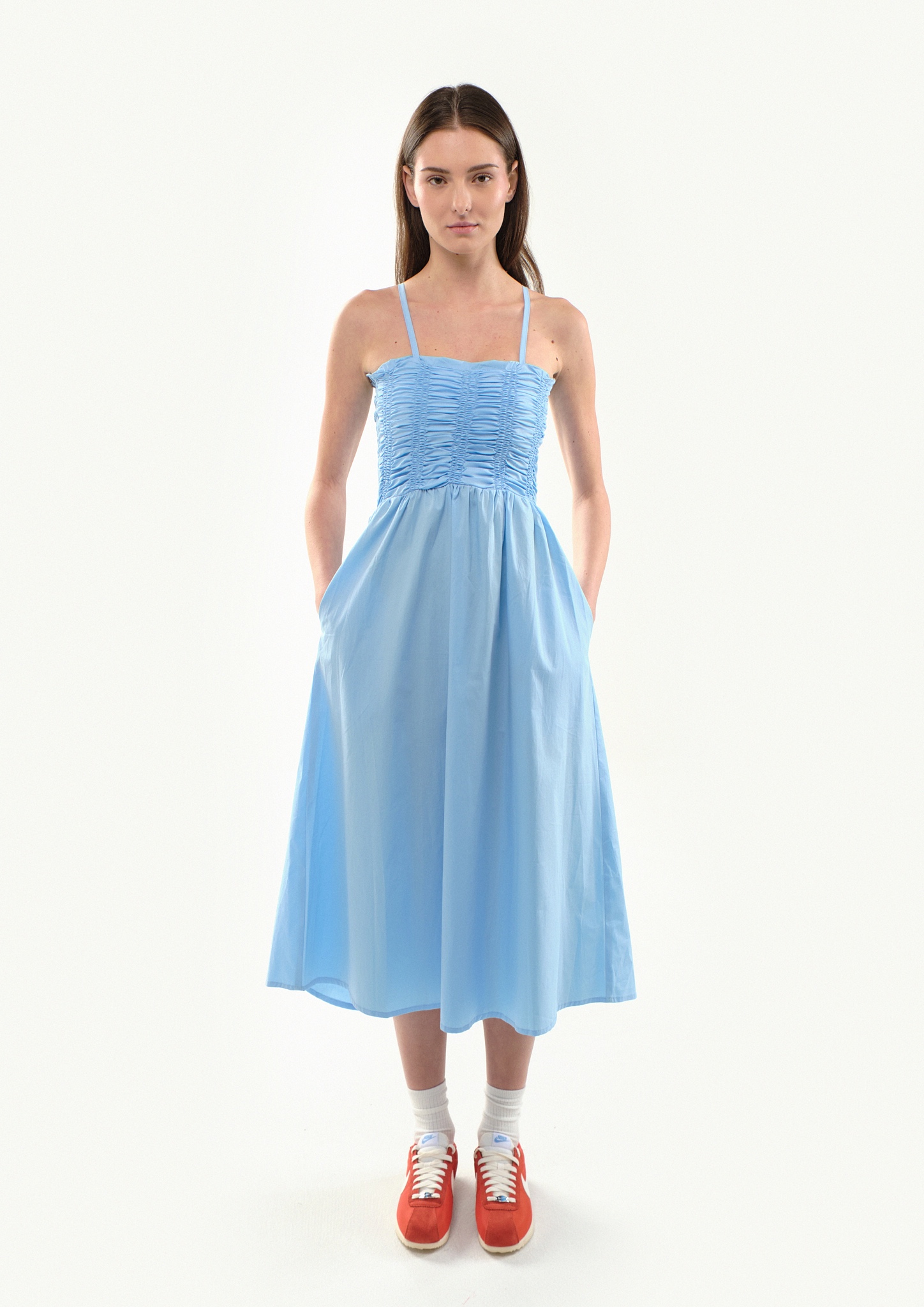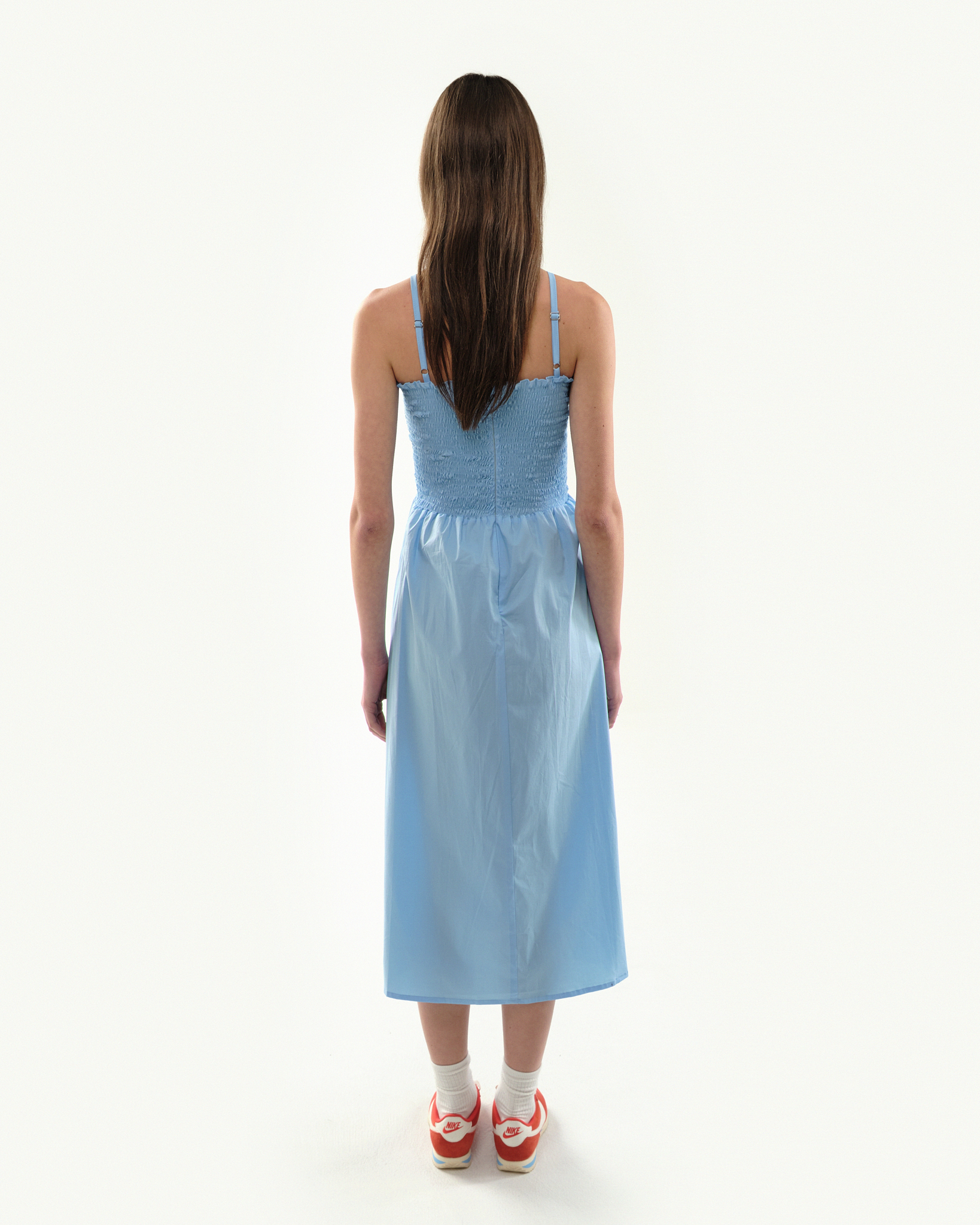 A vacation-inspired maxi dress with thin delicate straps, adjustable in length, and fitted through the bodice. The bodice is also shirred, allowing for stretch and additional comfort.