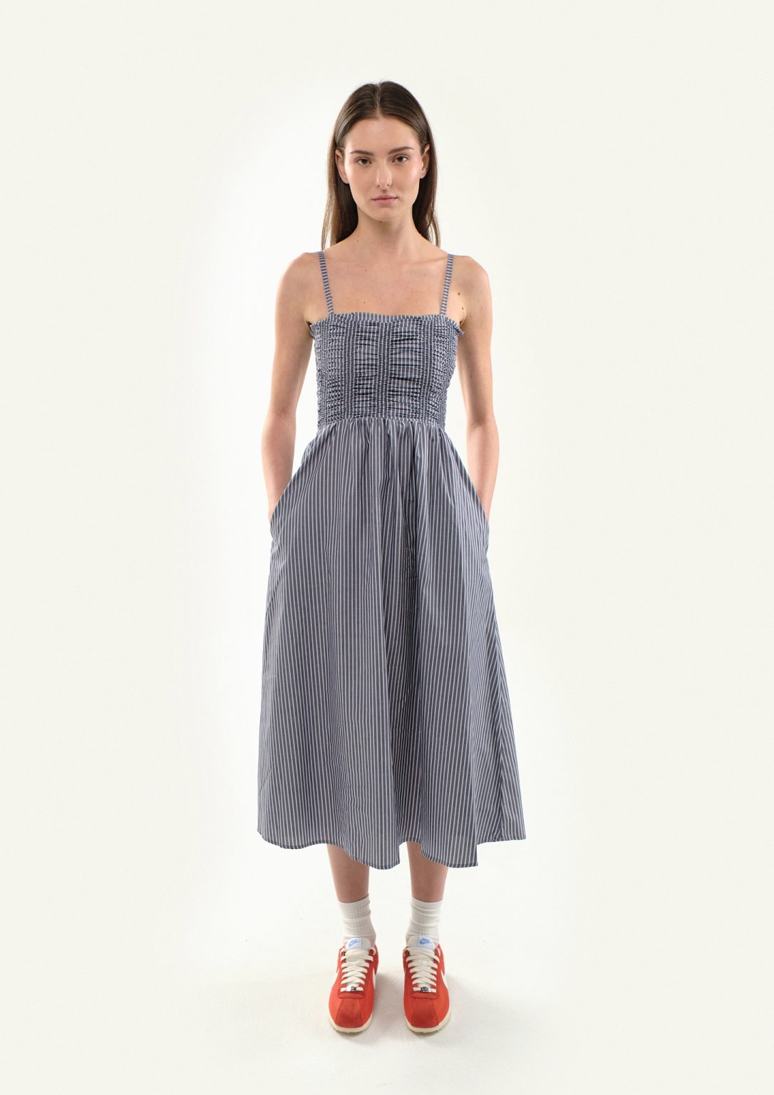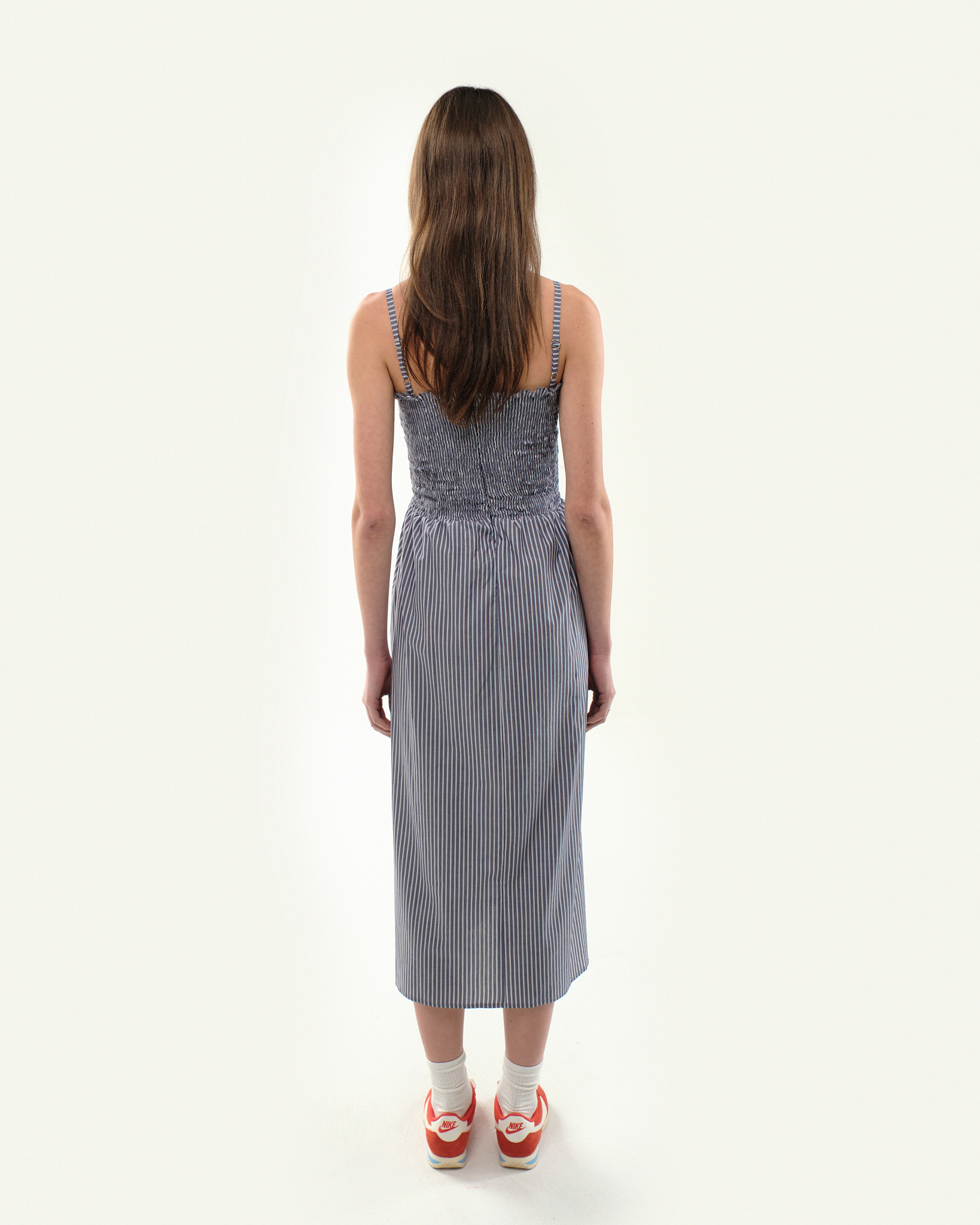 A vacation-inspired maxi dress with thin delicate straps, adjustable in length, and fitted through the bodice. The bodice is also shirred, allowing for stretch and additional comfort.