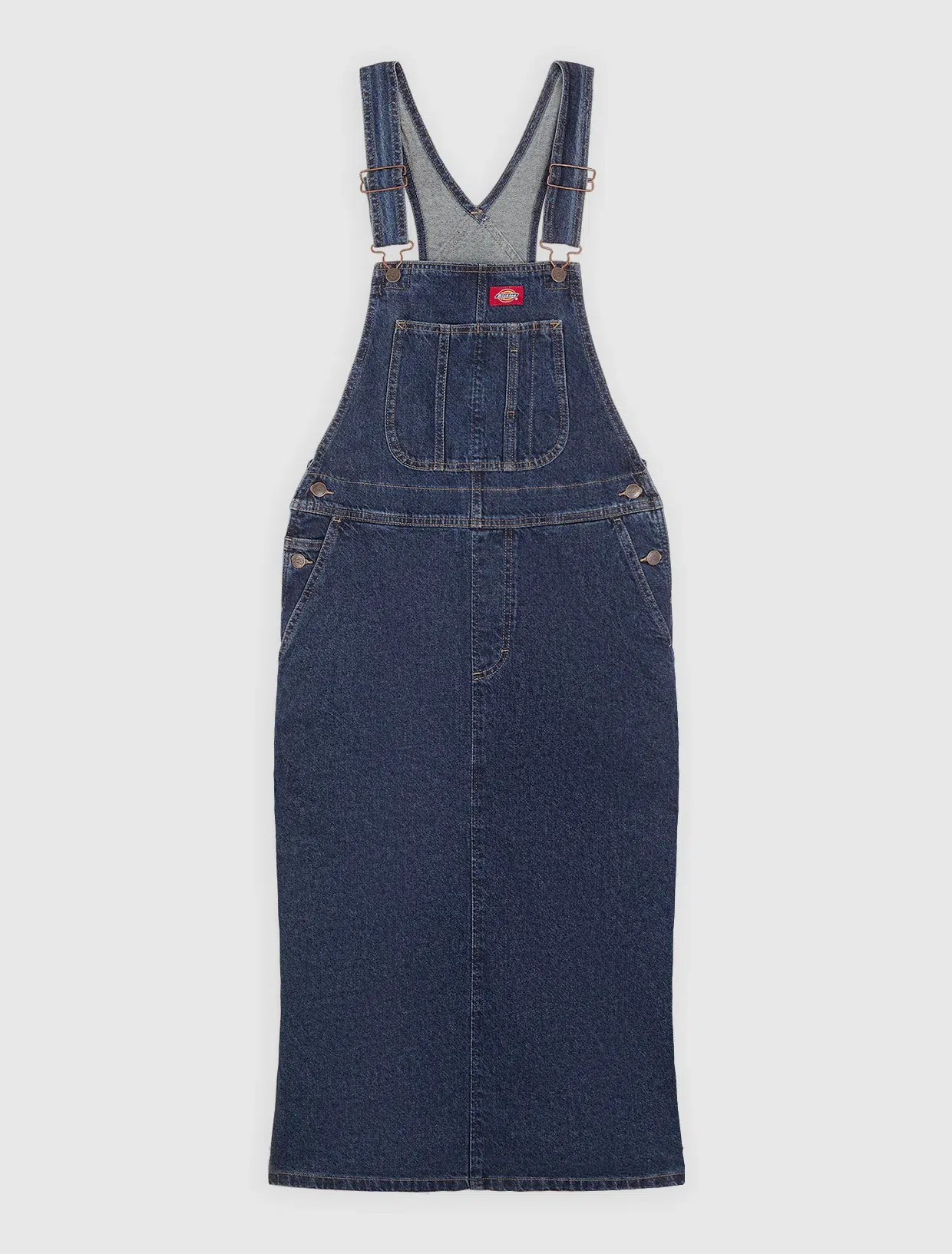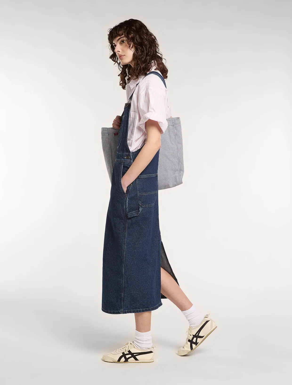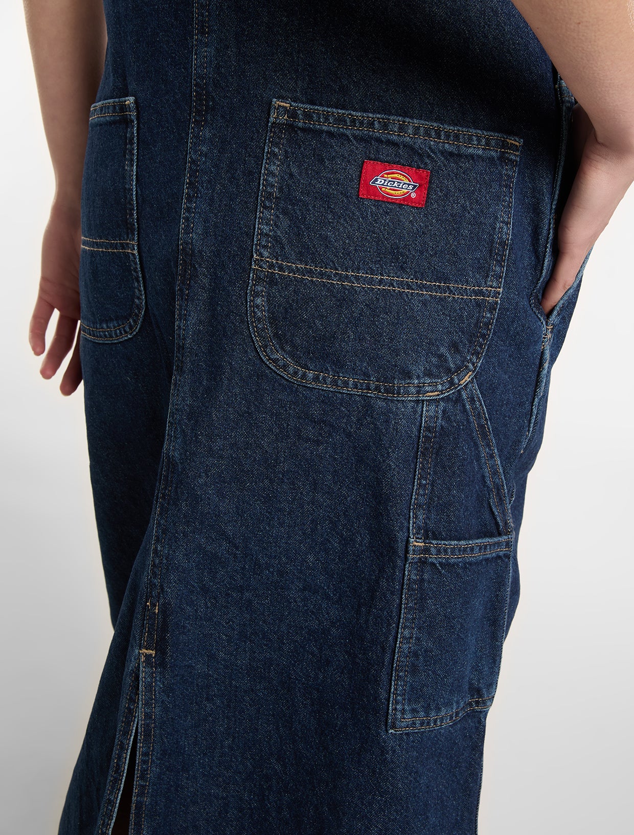 The denim midi dress features a loose fit and is designed for versatility and comfort. It includes all the classic denim details you need for a timeless look.