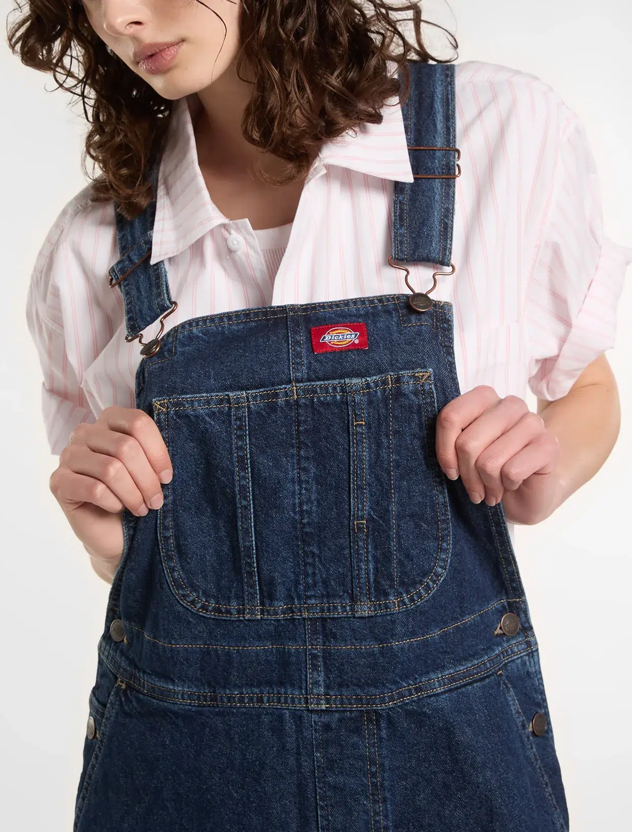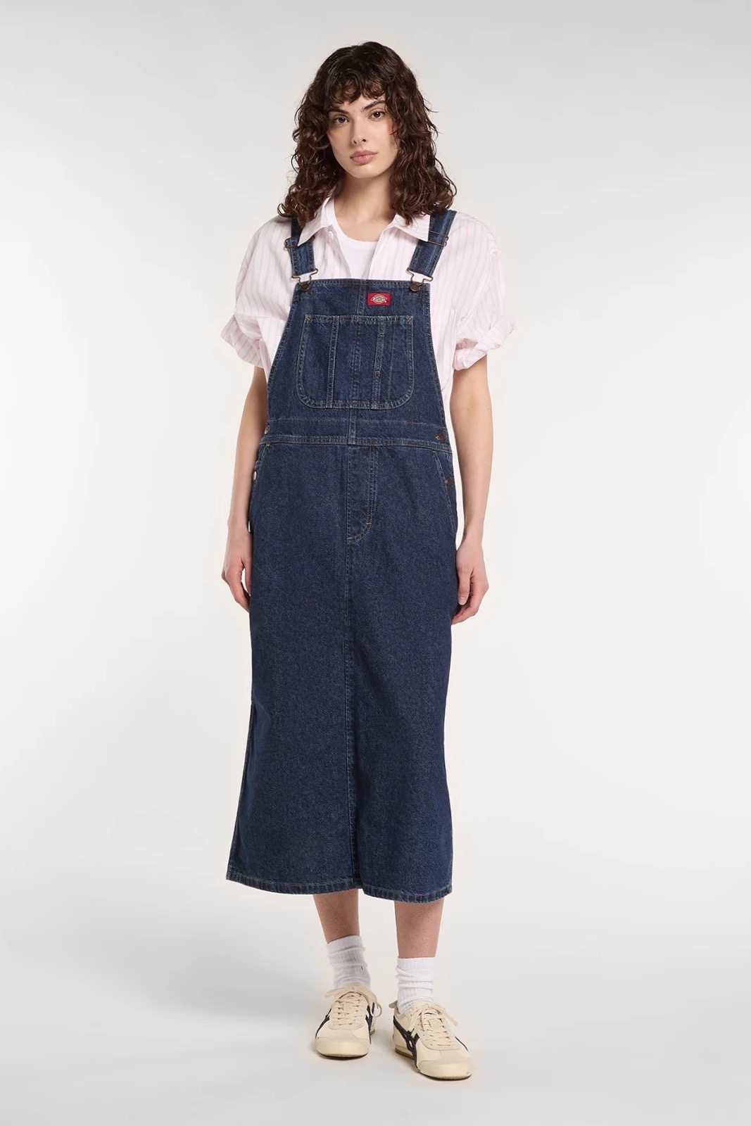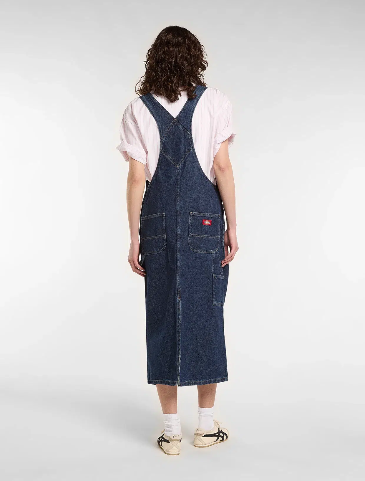 The denim midi dress features a loose fit and is designed for versatility and comfort. It includes all the classic denim details you need for a timeless look.