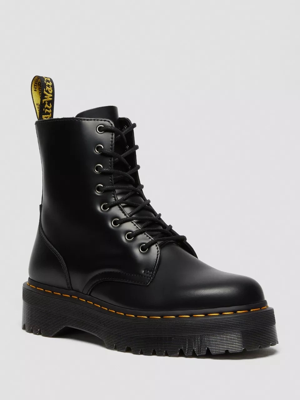 Looking for something bold? Look no further. The Jadon boot takes over 6 decades of Dr. Martens DNA and attitude and transforms it into a unique, head-turning platform style. Inspired by our Original 8-eye boot, the Jadon boot is crafted from Polished Smooth leather that you can scuff or polish however you choose. The formidable Quad sole has our distinctive grooving pattern and yellow welt stitching, and the top of the boot is tagged with a black and yellow heel loop. The boot is also fitted with a convenient inside zip — for attitude on the move, no matter the outfit.