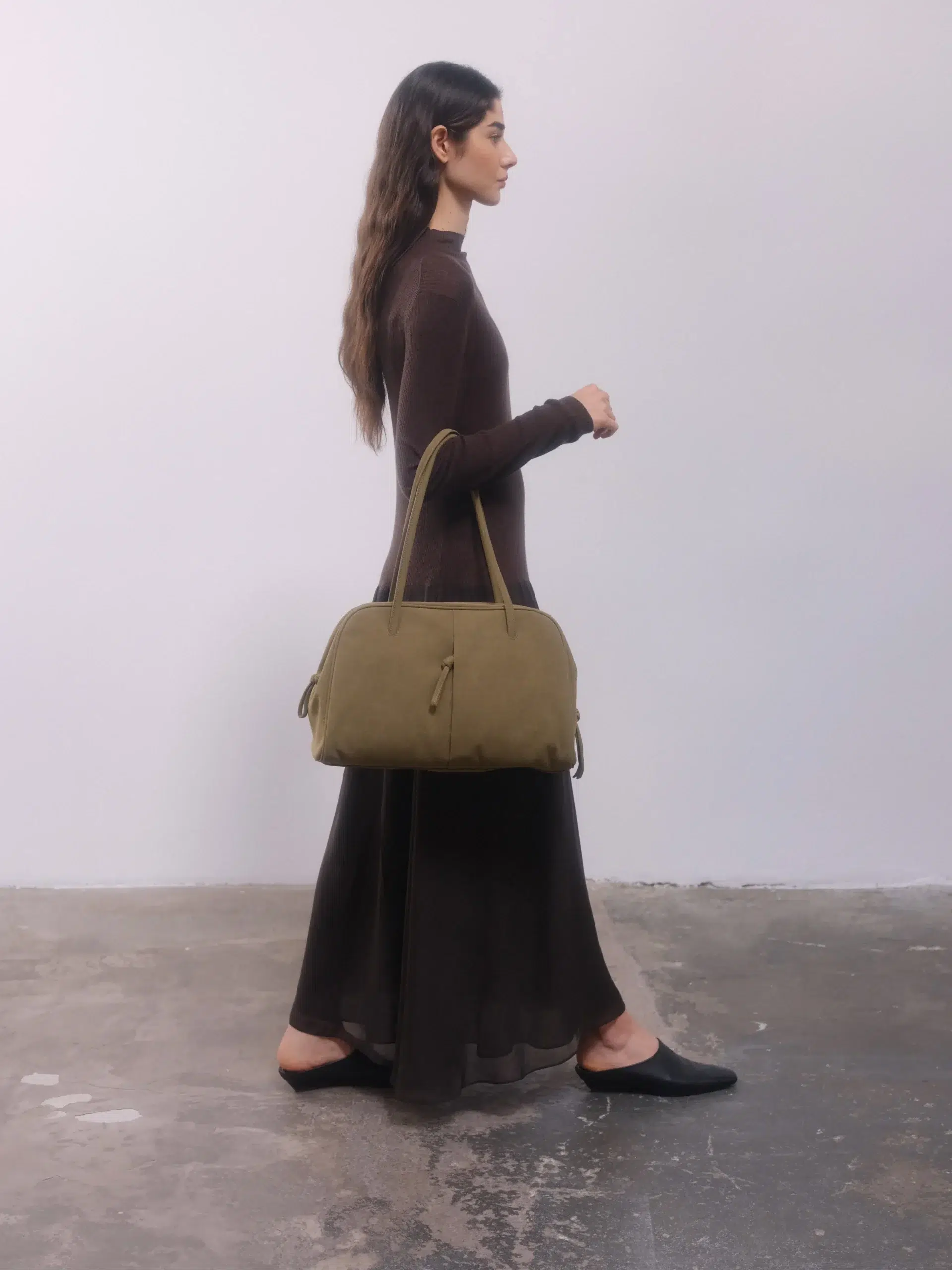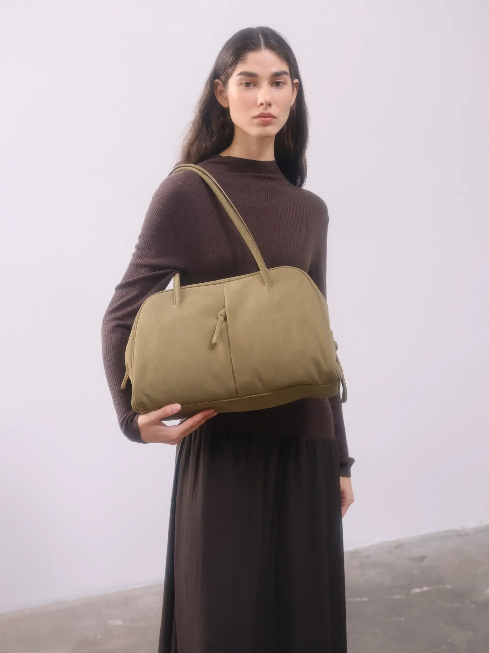 Its iconic curved silhouette is accented with minimal details, making it a versatile companion from office hours to off-duty moments. The Bowling Bag blends beauty with practicality in every stitch