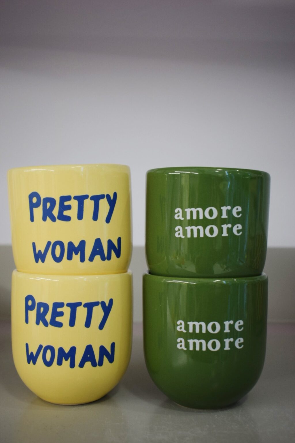 New gloss glaze round 2 dcl cup, with white decal ; Amore Amore
