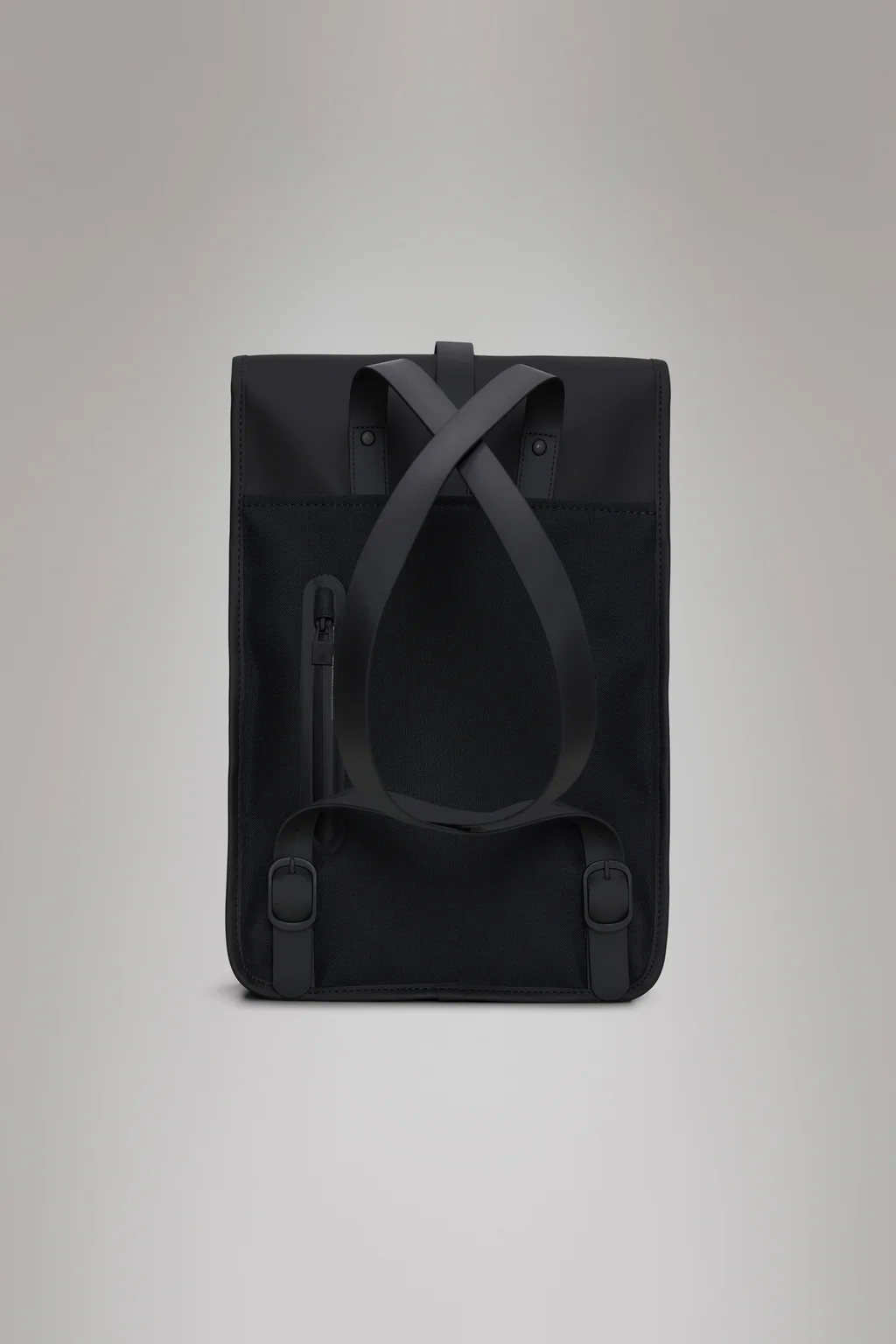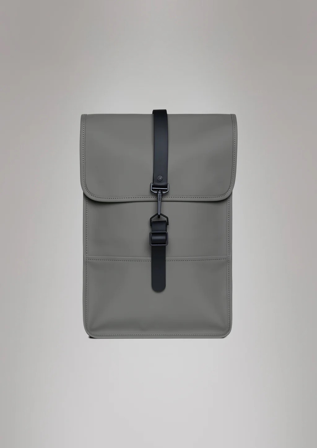 Backpack Mini is a downscaled version of Backpack. The silhouette is characterized by its prominent flap and central strap with carabiner closure. This clean and ever contemporary waterproof rucksack features an internal laptop pocket, a main compartment, and a concealed external phone pocket on the back panel.