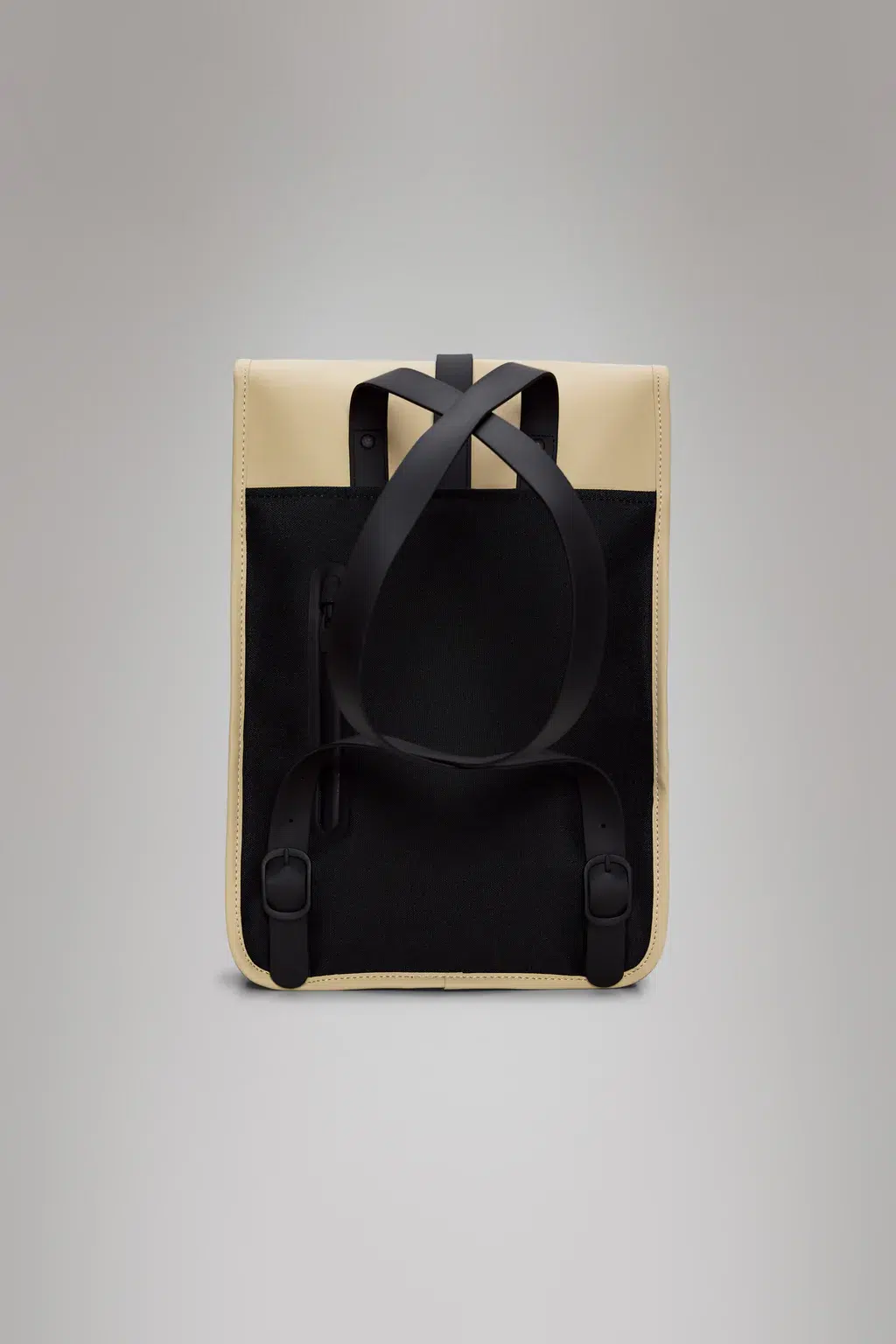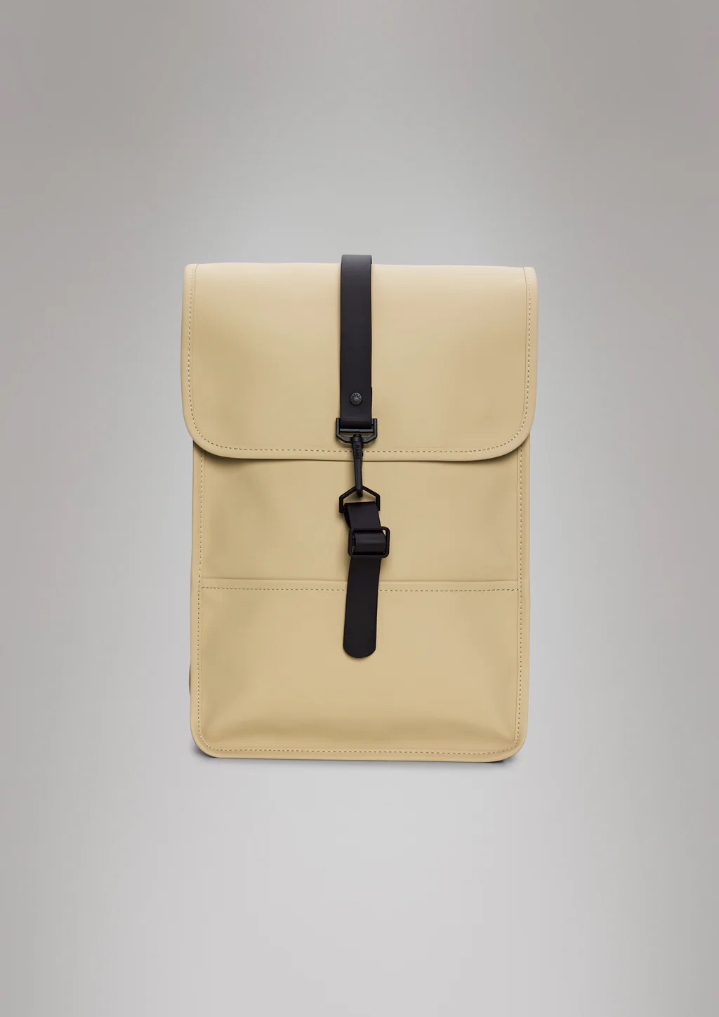 Backpack Mini is a downscaled version of Backpack. The silhouette is characterized by its prominent flap and central strap with carabiner closure. This clean and ever contemporary waterproof rucksack features an internal laptop pocket, a main compartment, and a concealed external phone pocket on the back panel.