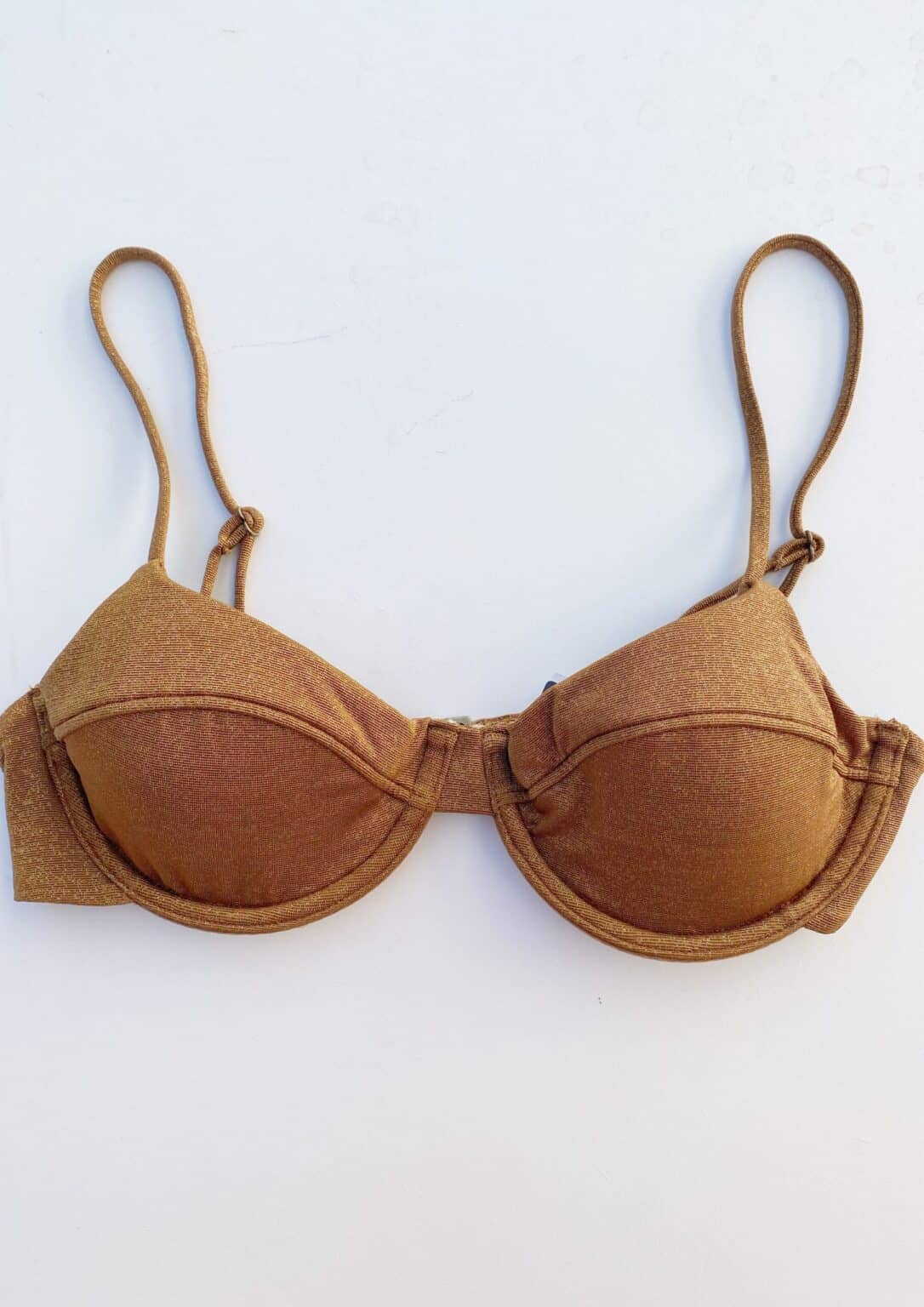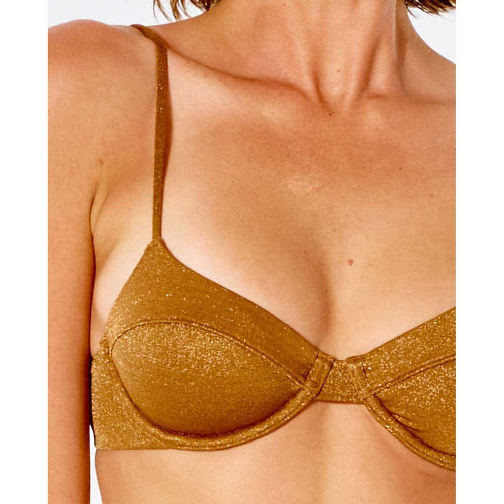 A balconette is a beach staple in every woman’s arsenal. The Playabella Balconette is a fully lined bikini top that provides enhanced support and shape with flattering results. Designed with adjustable straps, removeable padding, and a lurex polyamide elastane with a precious metal appearance.